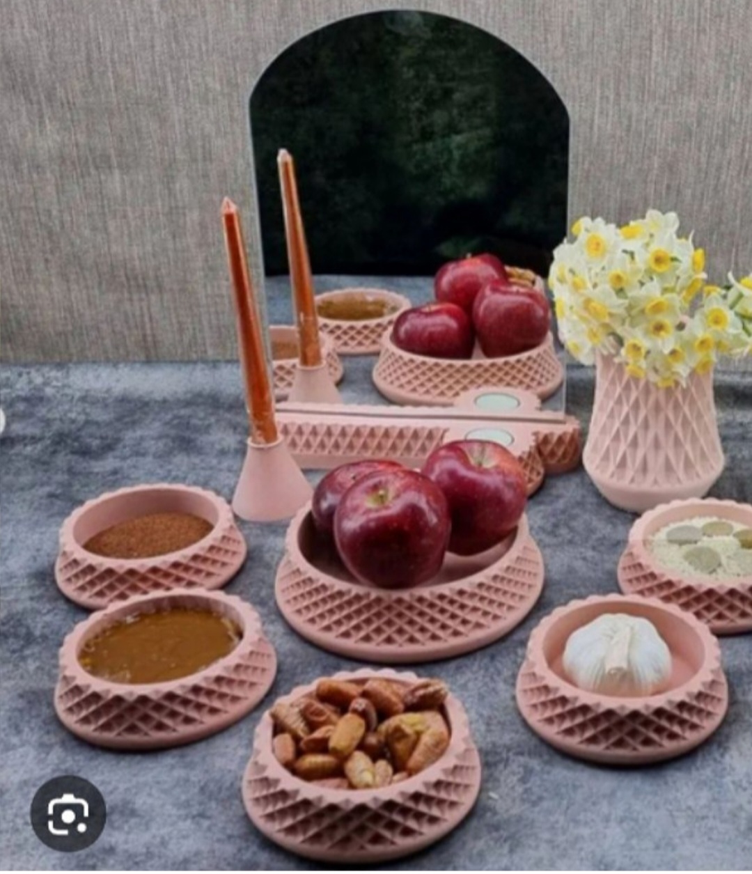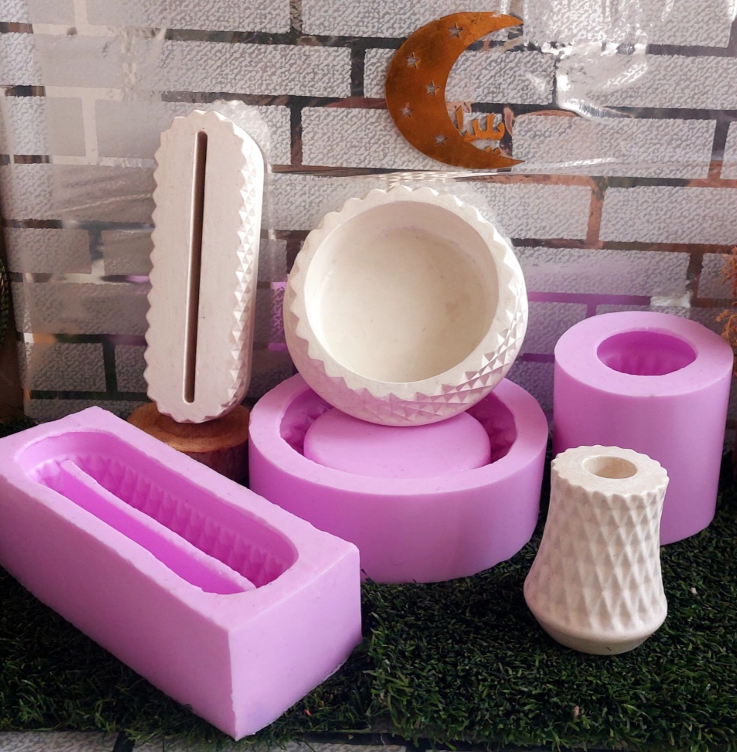 قالب سیلیکونی ست هفت سین لوزی این ست شامل سه قالب ظرف و شمعدون و استند آینه است .مناسب ساخت هفت سین با پودر سنگ هنری و رزین پلی استر